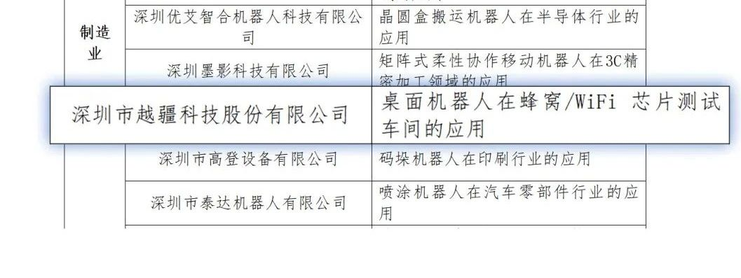 近日,深圳市工業(yè)和信息化局發(fā)布了《深圳市智能機器人應(yīng)用示范典型案例》(第一批)的通知,越疆憑借「桌面機器人在蜂窩/WiFi 芯片測試車間的應(yīng)用」入選其中,并成為首批上榜的企業(yè)。